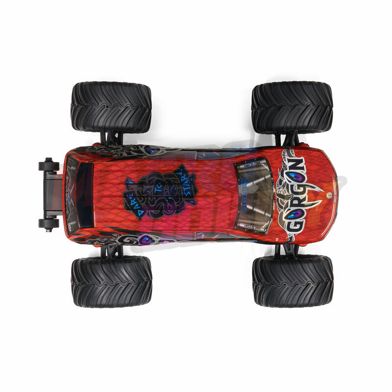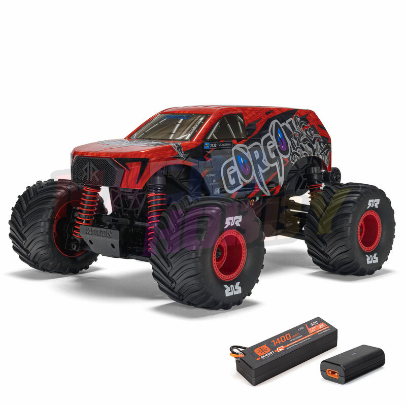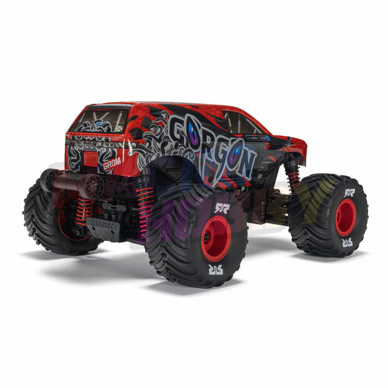 ARRMA GORGON GROM 4X4 RTR RC MONSTER TRUCK OVERVIEW Like the legendary creature that turned heroes to stone, the ARRMA GORGON GROM 4X4 RTR Monster Truck strikes fear—or envy—in every driveway and dirt track it haunts. Forged for both newcomers and seasoned bashers, the GORGON GROM packs the raw power and untamed spirit of a true monster, all contained within a compact and powerful frame. From the moment it's summoned from the box, the GORGON GROM is ready for a full-throttle rampage. No build, no extra gear. Just charge the battery, hit the throttle, and go. The clipless body system makes it easy to access the battery or get back on the road after a crash—no pins to lose, no tools required. Underneath, the reinforced chassis and high-travel suspension is built to withstand every petrifying impact and keep going. This truck isn't just tough. It's smart. The deep tub chassis keeps out dirt and debris so you can bash harder without clogging the works. The monster truck stance and elevated center of gravity allow it to conquer all obstacles in its way. Chaos, indoors or out, is where the GORGON GROM rules. The battery tray uses two catches that swing into place, keeping things simple for new drivers or anyone who wants more time bashing and less time tinkering. Every element is designed for relentless action, worthy of its mythic namesake. No distractions. No mortal weaknesses. The GORGON GROM isn't just a truck, it's an awakening. Whether it's your first truck or your fiftieth, this mini monster means business. Compact size. Full-throttle fun. Bash harder, faster, and longer, wherever you are. Bone-rattling monster truck mayhem starts here. ARRMA GORGON GROM ACTION VIDEO ARRMA WHY DID WE DO THIS?! // @ARRMARC GORGON [ARA2130] AND QUAKE [ARA2137] GROM UNDER THE HOOD VIDEO ARRMA GORGON GROM 4X4 RTR RC MONSTER TRUCK FEATURES 100% ready-to-run Included 2S LiPo battery provides beginner-friendly 20 mph maximum speed Oil-Filled Differential Set upgrade already included High-traction 4WD drivetrain Easy clipless body attachment and removal Enclosed metal gear drivetrain for all-terrain toughness Reliable, high-quality hex hardware Durable composite chassis Independent suspension and oil-filled, coil-over shocks Tough monster truck wheels and tires Color coordinated wheels and shock springs Impact-absorbing front and rear bumper Brushed 380-Size Motor Spektrum SLT2 2-channel 2.4GHz radio Spektrum SLT 2-in-1 25A waterproof Brushed ESC and receiver Spektrum SX110 waterproof metal-geared servo Spektrum Smart 7.4V 1400mAh 2S 30C Hard Case LiPo Battery w/IC2 Connector Spektrum S10 Smart G2 Mini 2S USB-C Charger 4 “AA” transmitter batteries