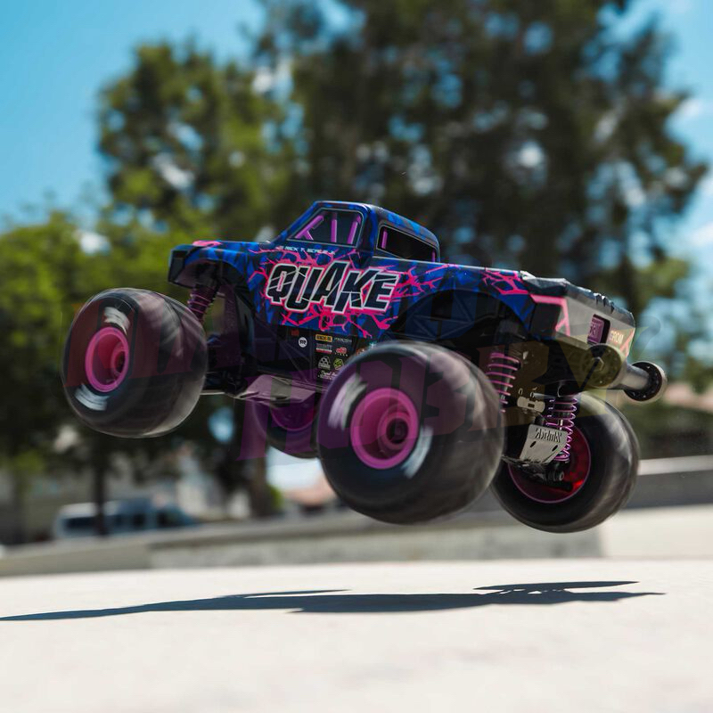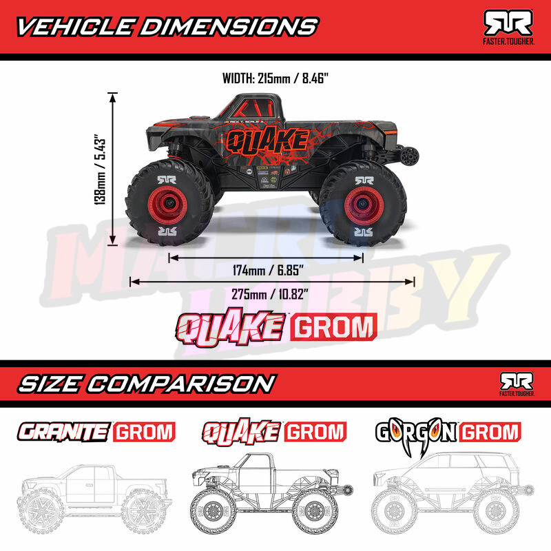 ARRMA QUAKE GROM 4X4 RTR RC MONSTER TRUCK OVERVIEW In the world of monster trucks, you either hit the throttle and let everyone feel it or go home. The ARRMA QUAKE GROM 4X4 RTR Monster Truck doesn't hold back. This machine brings real monster truck muscle to first-time drivers, without the setup or hassle. Beginners get a mini truck that isn't here to play small. It's here to rumble, roll, and shake the dirt wherever you drive. ARRMA made the QUAKE GROM for newcomers ready to send it. The chassis is compact, but the attitude is pure ARRMA: bold, brash, and tough enough to keep going after the first crash or the fiftieth. Open the box, charge up the battery, and the backyard becomes your new stunt ground in no time. What you get is straight-to-action design that delivers on ARRMA's wild streak. This truck packs what new drivers crave: fast setup, a ready-to-run experience, and components built for both beginners and bashing. The quick-release clipless body snaps on and off easily—you won't lose pins or fight with tools when you want to change the battery. The battery tray uses two catches that swing into place, so even if you tumble the truck or spin out, the body and battery stay secure and ready for more runs. The QUAKE GROM's suspension is tuned to leap, land, and keep rolling. High-travel shocks soak up jumps and bumps. The deep tub chassis keep out rocks and debris, so you bash harder without worrying about what's in your path. A high center of gravity gives the QUAKE GROM that telltale monster truck stance, letting it clear gravel and dirt piles with ease. Got a driveway, a dirt patch, or an empty stretch of garage? The QUAKE GROM handles them all, and its size means you can have fun indoors too—when the weather turns or you just want to keep bashing. Once you power up, throttle response is crisp and direct. ARRMA's signature send-it spirit is right here in a mini size. The chassis shrugs off hard knocks. That means the QUAKE GROM goes as hard as you want, jumping curbs, hitting ramps, and hammering through loose dirt. Maintenance and battery swaps are simple. Fun comes first. You won't outgrow the QUAKE GROM on the first day. This truck keeps giving, making each bash, jump, and roll a step toward bigger and bolder RC adventures. Whether you share it with family or claim it for your own, the QUAKE brings full-on monster truck action to anywhere you call a playground. If you want a start that feels like a statement, the QUAKE GROM 4X4 RTR delivers it, with the only thing small about it being the box it comes in. The ground floor of monster truck mayhem starts here. ARRMA QUAKE GROM ACTION VIDEO ARRMA WHY DID WE DO THIS?! // @ARRMARC GORGON [ARA2130] AND QUAKE [ARA2137] GROM UNDER THE HOOD VIDEO ARRMA QUAKE GROM 4X4 RTR RC MONSTER TRUCK FEATURES 100% ready-to-run Included 2S LiPo battery provides beginner-friendly 20 mph maximum speed Oil-Filled Differential Set upgrade already included Easy clipless body attachment and removal Enclosed metal gear drivetrain for all-terrain toughness Reliable, high-quality hex hardware Durable composite chassis Independent suspension and oil-filled, coil-over shocks Tough monster truck wheels and tires Color coordinated wheels and shock springs Impact-absorbing front and rear bumper Brushed 380-Size Motor Spektrum SLT2 2-channel 2.4GHz radio Spektrum SLT 2-in-1 25A waterproof Brushed ESC and receiver Spektrum SX110 waterproof metal-geared servo Spektrum Smart 7.4V 1400mAh 2S 30C Hard Case LiPo Battery w/IC2 Connector Spektrum S10 Smart G2 Mini 2S USB-C Charger 4 “AA” transmitter batteries