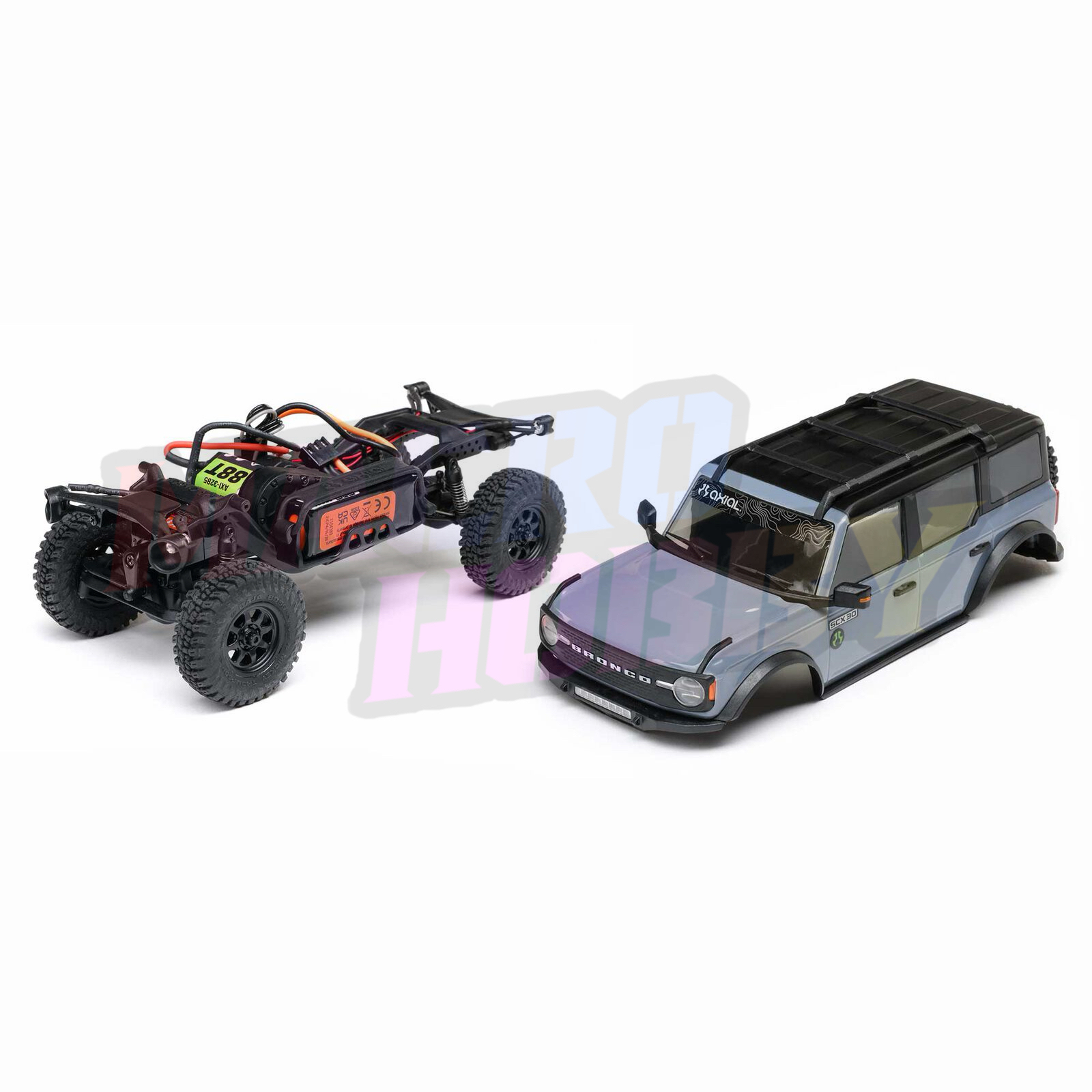 Product Details In The Box Axial SCX30 Ford Bronco 4X4 Rock Crawler RTR: Assembled SCX30 chassis, drivetrain, and suspension 1 Spektrum SLT2 2.4GHz radio transmitter 1 Spektrum SCX30 SLT Brushed 2-in-1 ESC/Receiver (SPMXSE3225RX, installed) 1 Axial 88T motor (AXI-3285, installed) 1 Spektrum 7.4V 160mAh 2S 30C LiPo battery (SPMX-1122) 1 USB 2S Charger: 0.5A JST-XH 3P 1 AA transmitter batteries 4 Instruction manual 1 Needed to Complete Absolutely nothing!