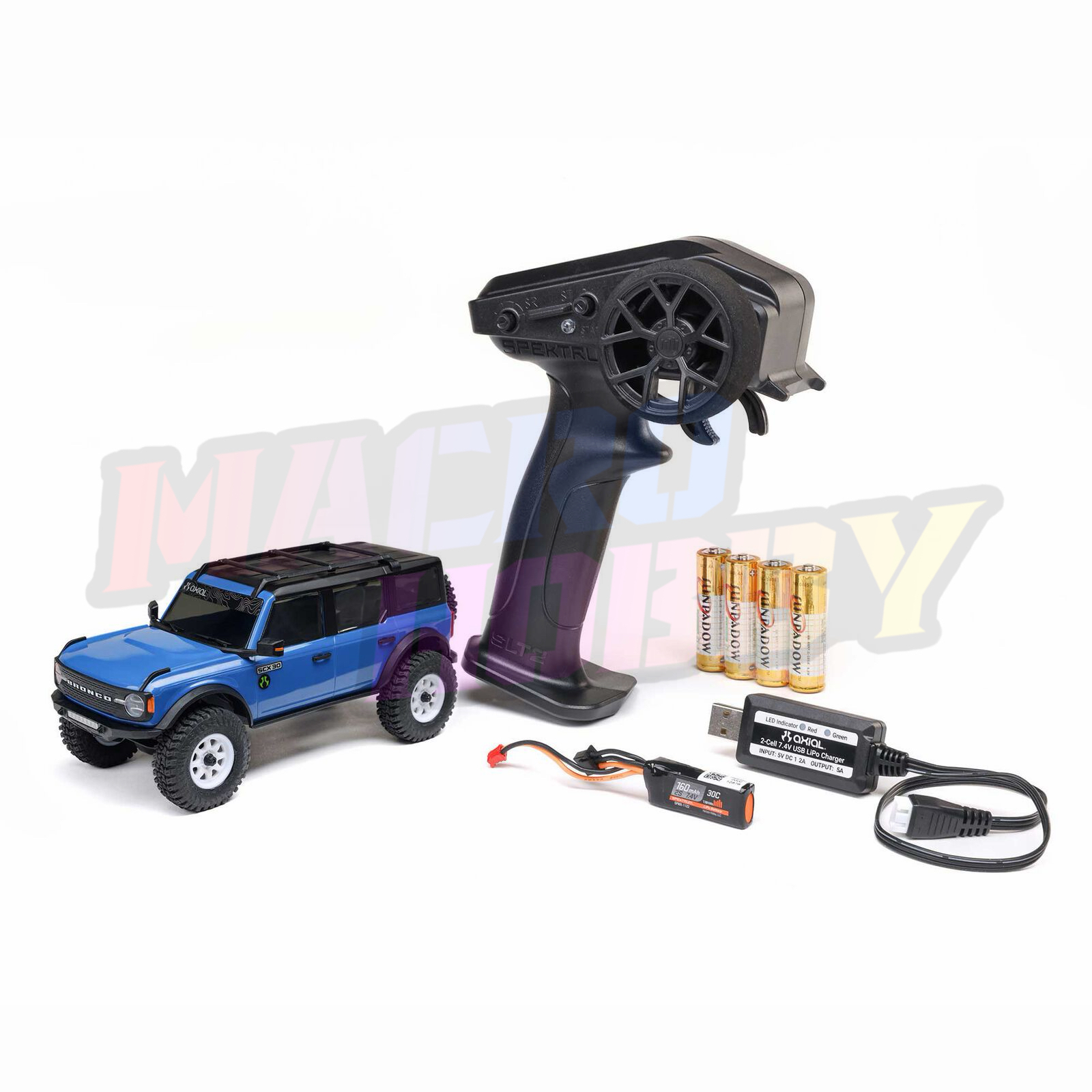 Product Details In The Box Axial SCX30 Ford Bronco 4X4 Rock Crawler RTR: Assembled SCX30 chassis, drivetrain, and suspension 1 Spektrum SLT2 2.4GHz radio transmitter 1 Spektrum SCX30 SLT Brushed 2-in-1 ESC/Receiver (SPMXSE3225RX, installed) 1 Axial 88T motor (AXI-3285, installed) 1 Spektrum 7.4V 160mAh 2S 30C LiPo battery (SPMX-1122) 1 USB 2S Charger: 0.5A JST-XH 3P 1 AA transmitter batteries 4 Instruction manual 1 Needed to Complete Absolutely nothing!