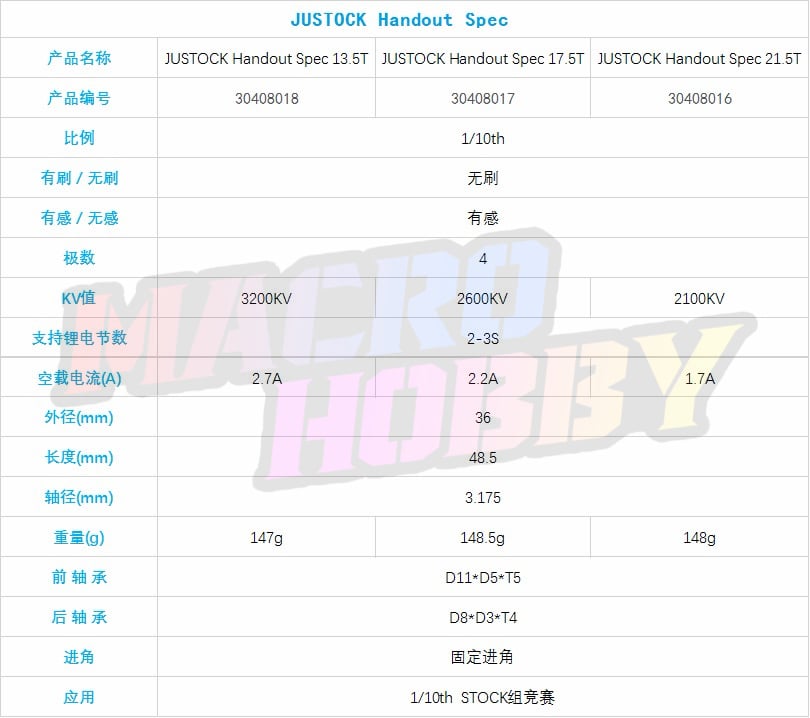 The Hobbywing XR10 Justock Handout Combo features a 60A ESC paired with a 17.5T 2600kV motor, delivering reliable and consistent performance for controlled racing environments. Ideal for spec-class competition, this sensor-based system offers smooth throttle response and simplified rules-compliant setup. Features Official handout combo for spec-class racing ESC delivers consistent 60A continuous and 380A peak current 17.5T brushless motor with 2600kV output for smooth and efficient performance Sensored design ensures precise throttle and braking control Built for reliability and consistency across controlled racing conditions Specifications ESC (XR10 Justock Handout) Continuous/Peak Current: 60A / 380A Input Voltage: 2S LiPo Dimensions: 40.9 x 33.9 x 32.1mm Weight: 75.4g (with wires) Motor (13.5T Handout Motor) Turns / KV Rating: 17.5T / 2600kV Input Voltage: 2–3S LiPo Dimensions: 36mm diameter x 48.5mm length Shaft Diameter: 3.175mm Weight: 147g Includes 1 x Hobbywing XR10 Justock Handout ESC (60A) 1 x Hobbywing Justock Handout 17.5T 2600kV Motor Important Notes Designed specifically for handout and spec-class race formats Compatible with sensored systems for refined control and racing consistency