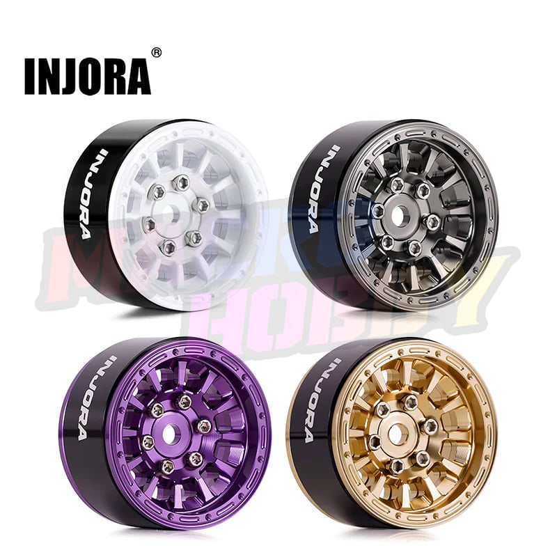 INJORA 1.0" Aluminum Beadlock Wheels 0mm Offset for 1/18 1/24 RC Crawler (W1056) Features: 0mm offset design for a standard track width CNC-machined aluminum for high precision and durability Multi-spoke styling adds a clean and modern scale look Available in White, Gold, Purple and Titanium to match different styles Specifications: Part Number: W1056 Material: Aluminum Offset: 0mm Outer Diameter: 28mm Width: 15.4mm Wheel Hub: 7mm Weight (Each): 12g Package List: 4 × INJORA 1.0" Wheels