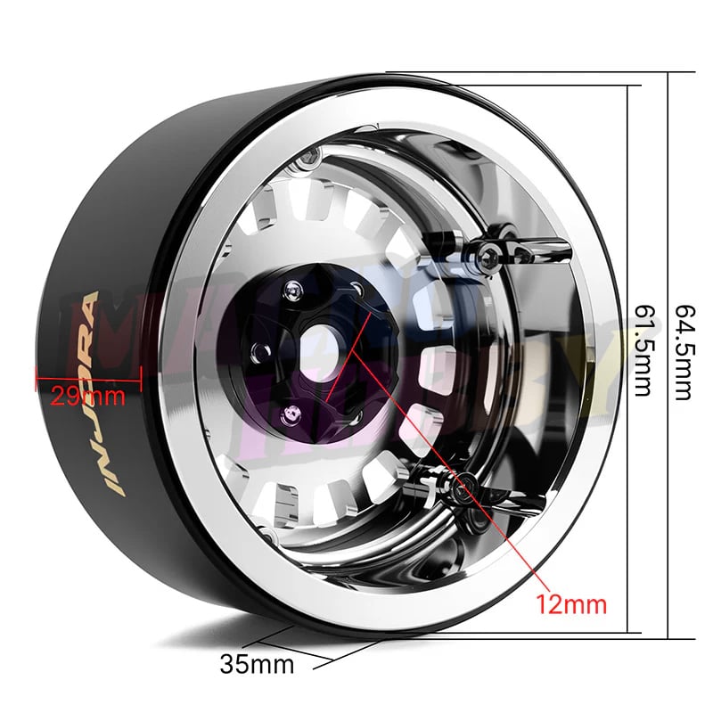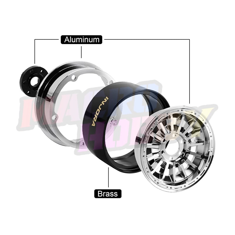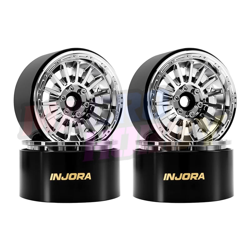 INJORA Brass & Aluminum 0mm Offset 2.2" Beadlock Wheels for 1/10 RC Crawlers (W2259) Features: 210g/pcs super heavy weight Made of brass and aluminum mixed material Multi-Spoke design to enhance the visual appeal Available in Black, White, and Chrome to match different styles Specifications: Part Number: W2259 Material: Brass, Aluminum Color: Black, White, Chrome Offset: 0mm Outer Diameter: 61.5mm Width: 35mm Wheel Hub: 12mm Weight (each): 210g Package List: 4 × RC Car 2.2" Wheels