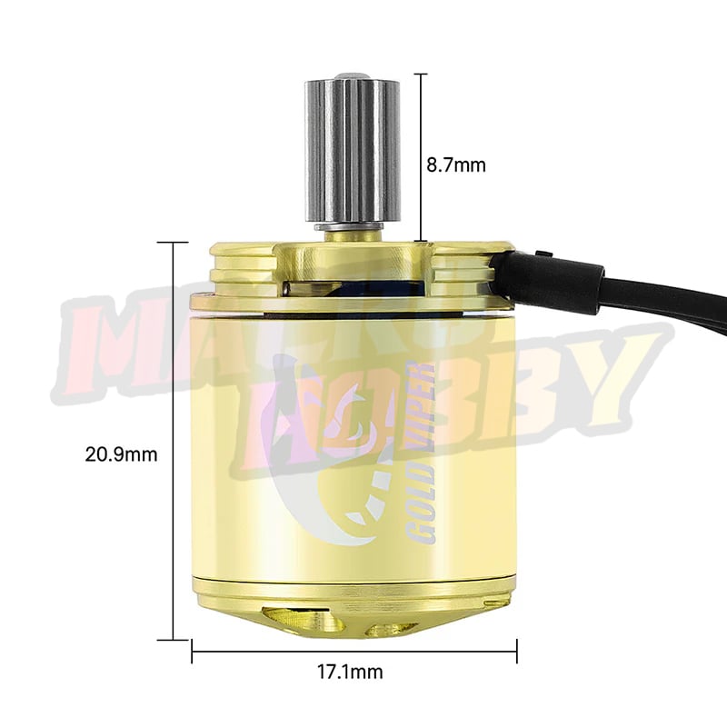 INJORA Gold Viper 1721 Brushless Motor 2800KV for 1/18 TRX4M Ascent-18 Compatibility: ESC: Only compatible with INJORA MBL32 ESC and QuicRun Mini24 ESC. Not compatible with other ESCs! Transmission: Compatible with 1/18 TRX4M, 1/18 Redcat Ascent18 transmissions, not compatible with 370 transmission. Battery: 3S batteries are highly recommended for optimal performance and smoother low-speed control. Note: Some noise at mid-throttle is normal for the 1721 motor due to its high-speed, open-rotor design. This does not indicate a defect. The 1721 Gold Viper is best for rigs under 700g. For heavier rigs, we recommend the 2204 Fat Viper for stronger drag brake performance. Features: New gold finish for a more eye-catching appearance Reduces mid-range noise with slightly improved torque output Includes a protective sleeve at the wire outlet for enhanced durability Delivers smooth and linear control at low speeds, with powerful and aggressive performance at high speeds Motor Specifications Model Number: 1721 Waterproof: Yes Motor Type: Sensorless Brushless Outrunner RPM/Volt: 2800KV Motor Poles: 14 Motor Slots: 12 No-Load Current (11.1V): 0.7A Max Current: 20A Motor Connectors: PH2.0 3-Pin Dimensions: 17.1*20.9mm Output Shaft Diameter: 2mm Motor Pinion: 0.4Mod 11T Weight: 19g Package List: 1×1721 Brushless Motor 1×Motor Pinion