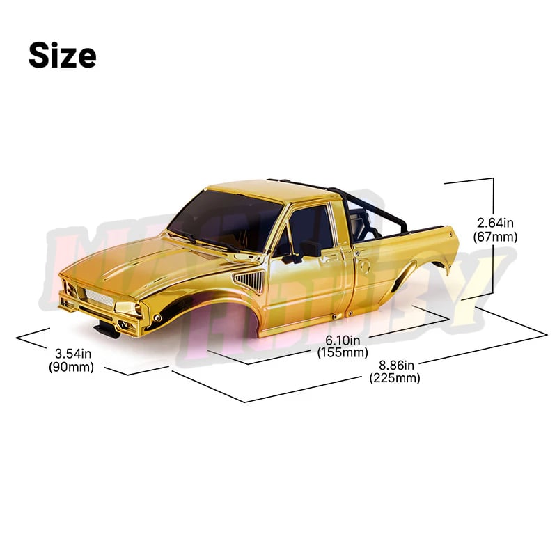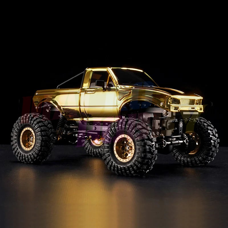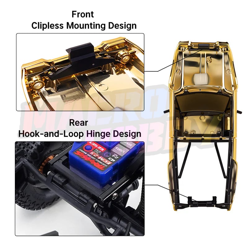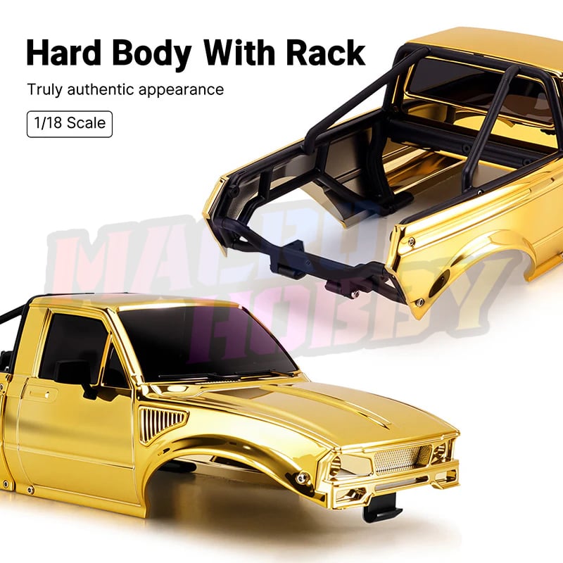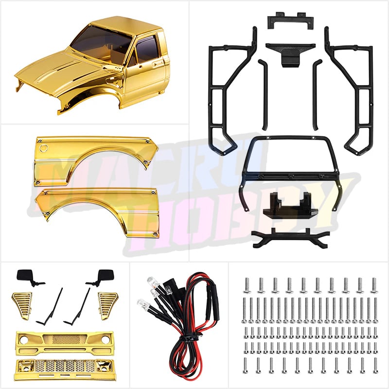INJORA Limited Edition IR60 Pickup Hard Body for 1/18 TRX4M Defender Bronco (Gold) Only compatible with: Stock TRX4M Defender & Bronco chassis INJORA Universal TRX4M chassis Features: Limited special gold edition for enhanced visual recognition. ABS pickup hard body with rear bed rack. Comes with two styles of front grille. Rubber rearview mirrors for better durability. Four screws, endless possibilities. Attach the body shell to the chassis with just a twist. Easy as that! Front clipless mounting design and rear hook-and-loop hinge design. The hook-and-loop hinge allows quick access to the chassis and battery by simply swinging the body upward. Specifications: Part Number: IR60 Material: ABS Plastic Color: Gold Weight: 78g Wheelbase: 155mm Size: 225×90×67mm Package List: 1×IR60 Body Kit 1×Front & Rear Led Light 1×Body Assembly Manual