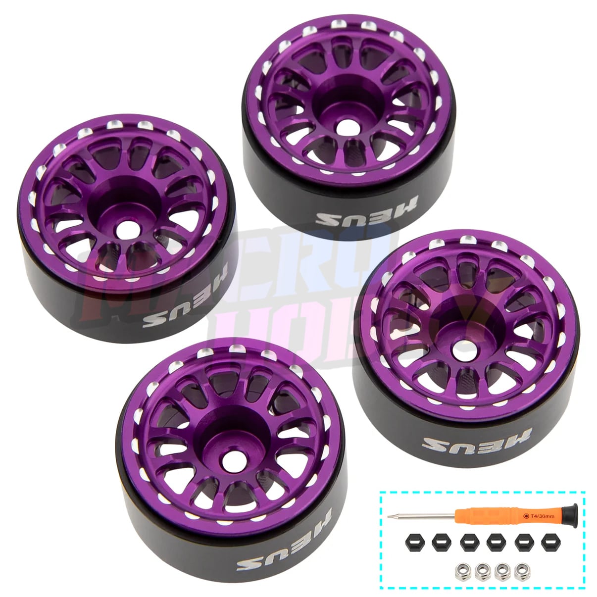 MEUS Racing 0.7-inch Beadlock Wheels Rims Deep-Dish Wheel for 1/30 Axial SCX30 1/32 Redcat Ascent-32 RC Crawler Upgrades. The hex hub adapter in the package is for the Axial SCX30 crawler, while the Redcat Ascent-32 Redcat Ascent-32 and other micro cralwers using 5mm hex adapter does not require the adapter for installation Key Features: 1. CNC machined, scale finish, anodized with exquisite appearance. 2. Beadlock design effectively prevents tires from falling off while driving, meanwhile requires no glue work. 3. Made of aluminum, 4.1g/Pc to provide enough weight for your RC Crawlers, ensuring greater driving stability. 4. The hex hub adapter in the package is for the Axial SCX30 crawler, while the Redcat Ascent-32 Redcat Ascent-32 and other micro cralwers 5. Using a 5mm hex adapter does not require the adapter for installation 6. Suitable for 1/30 Axial SCX30, 1/32 Redcat Ascent-32 RC Crawler. Specifications: Wheels and rims materials: Aluminum alloy Weight: 4.1g/pc Package List: 4pcs × 0.7-inch wheels