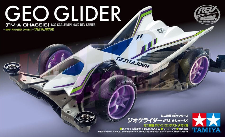 Maximum G! This assembly kit creates the Geo Glider, a sleek Mini 4WD car with a body which won the TAMIYA AWARD in the 2018 Mini 4WD Design Contest held in Japan. Its honed silhouette features lines you’d expect to see on a fighter jet, complete with a distinctive X-shaped cowl over the cockpit. The body is molded in pearl white ABS resin, and can be decorated with the included stickers for logos and other graphics. FM-A: Aerodynamic Front Motor Chassis The FM-A chassis is a front motor unit with advanced aerodynamic themes that – thanks to its center of gravity toward the front – is at home on a whole variety of track types including those with frequent elevation changes. It comes equipped with a low-friction front skid bar, while the chassis underside allows easy access to the motor and quick setup changes. Aircraft-inspired aero side stays allow attachment of a range of Grade-Up parts. The chassis is molded in durable olive gray ABS, with low friction A parts such as underpanel in black. Purple large-diameter V-spoke wheels are combined with arched tires, and the model includes a motor and 4.2:1 gears. Specifications ★Length: 156mm ★Width: 97mm ★Height: 46mm ★Includes motor ★Easy snap-together assembly Separately Required Items ★R6/AA/UM3 batteries (x2)