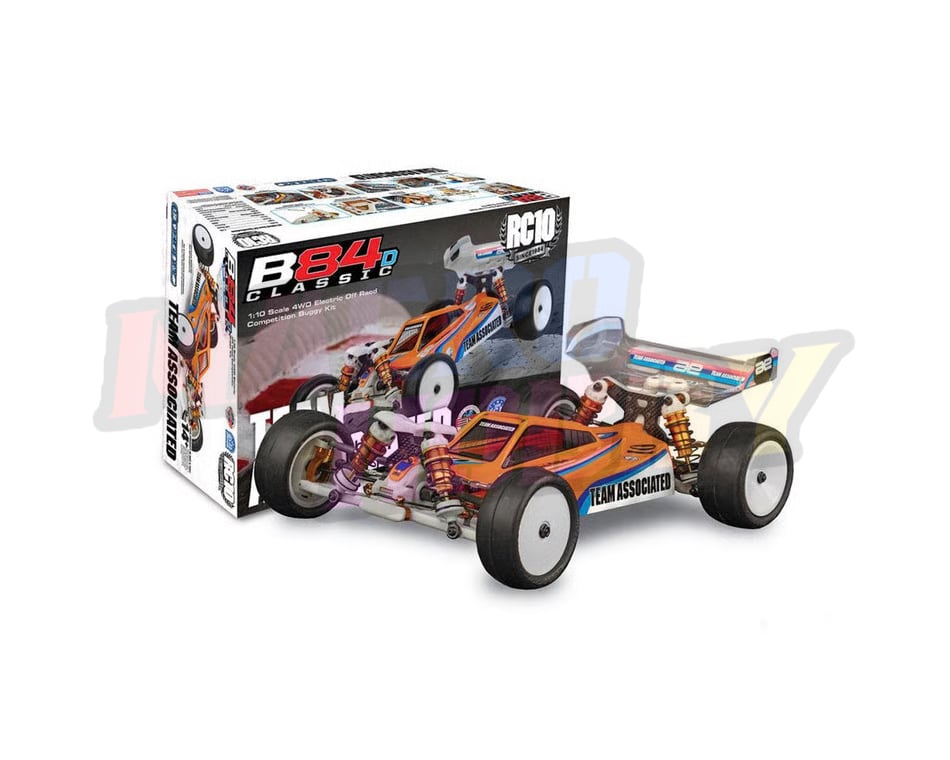 Vintage RC Heritage - Modern 4WD Dominance Born from legendary RC10 heritage and engineered with modern race technology, the RC10B84D Classic delivers razor-sharp handling, tunable performance, and podium-ready 4WD capability for drivers who demand precision, speed, and championship-level control. About the Limited Edition RC10B84D Classic Kit Born from Racing History The RC10B84D Classic blends iconic RC10 heritage with race-proven design, featuring classic-inspired livery, premium composite plastics, and aluminum components that honor Team Associated’s championship roots while delivering modern competition performance. True 4WD Evolution A refined 4WD drivetrain with molded height-adjustable gearboxes, molded ring and pinion gears, and multiple motor positions provides exceptional traction, balance, and efficiency across low- to high-grip track conditions. Modernized Vintage Engineering Long-arm suspension geometry, optimized steering bellcranks, adjustable caster blocks, and tunable chassis bracing combine to deliver predictable handling, reduced bump steer, and precise setup control without sacrificing durability. Ready for the Track Outfitted with a low-profile body, 7-inch rear wing, dual-height wing mounts, 13mm big-bore shocks, 3.5mm turnbuckles, and shock tower covers, the RC10B84D Classic is fully equipped to push hard and compete at the highest level right out of the box. Features: Classic RC10-inspired livery with premium composite and aluminum parts True 4WD drivetrain for maximum traction and control Molded height-adjustable front and rear gearboxes Long-arm suspension for improved grip and predictability Optimized steering system reduces bump steer at all ride heights Adjustable chassis bracing to fine-tune flex and handling Forward and rear motor mounting positions for weight balance tuning Adjustable battery holder with thumb tabs for quick changes 2.5mm 7075-T6 aluminum chassis with 10° kickup 13mm big-bore shocks for smooth, consistent damping Includes: (1) RC10B84D Classic 1/10 4WD Off-Road Electric Buggy Limited Edition Kit (1) Body & Wing (1) Manual Needed To Complete: 1:10 scale electric motor and electronic speed control 7.4V-7.6V 2S LiPo with "shorty" battery dimensions Compatible battery charger 2-channel surface transmitter, 2-channel receiver, and steering servo Polycarbonate specific spray paint for body 1:10 scale off-road wheels and tires Tools & Silicone fluids Specifications: Scale 1:10 Drive 4WD Power Source 2S LiPo Shorty Length 15.55in (395mm) Wheelbase - Width - Height - Weight Varies Assembly Level Kit*