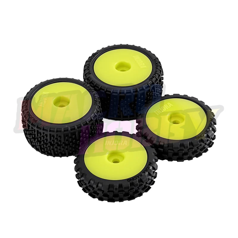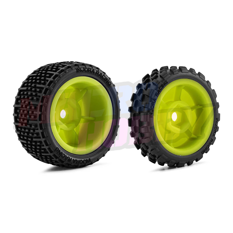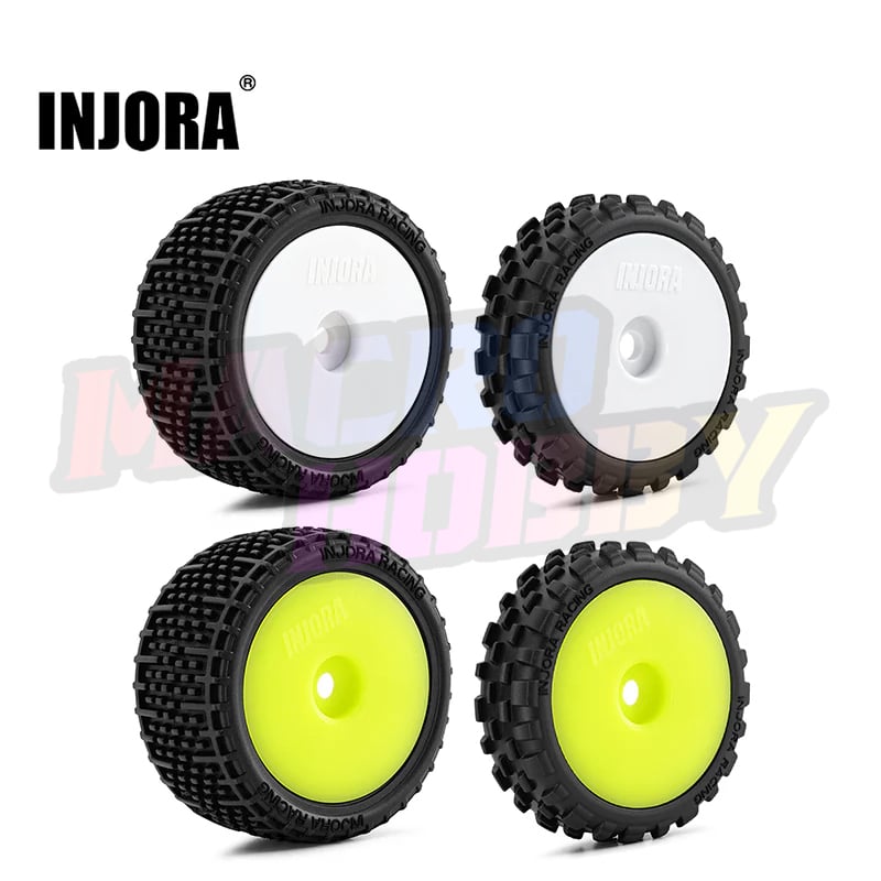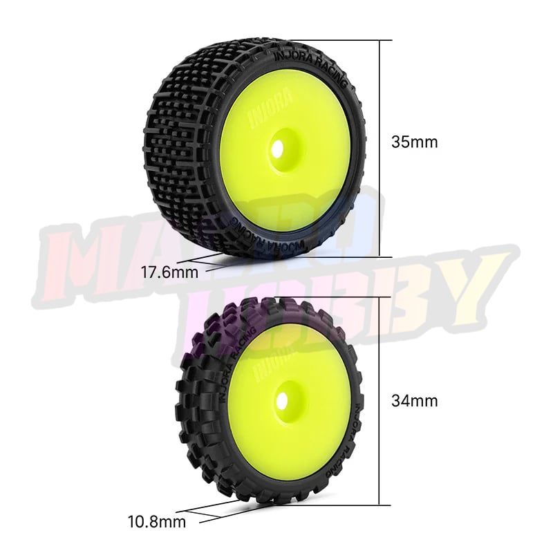 INJORA Unglued Pin Buggy Tires & Wheels for 1/24 Losi Micro-B Note: Tires and wheels come unglued and require gluing before use. Features: INJORA high-traction B1 rubber compound provides excellent grip on various surfaces Lightweight one-piece wheels with a scale-inspired design Micro pin tread pattern delivers optimal off-road control Available in White and Yellow wheel colors Specifications: Part Number: MBT03 Tire Compound: B1 Wheel Material: Durable Nylon Wheel Color: White, Yellow Tire Size: 34×10.8mm, 35×17.6mm Wheel Hex Size: 7mm Weight (each): 3.8g, 5.5g Package List: 4 × Unglued Tires & Wheels 4 × Foam Inserts