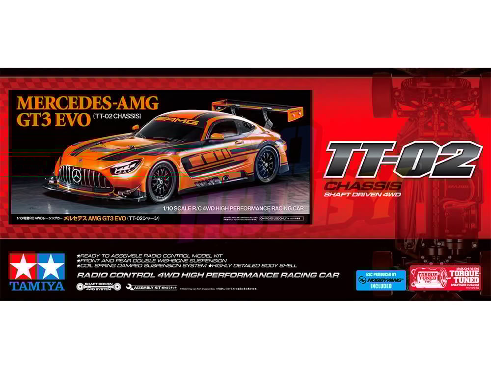 田宮 58750 1/10 RC遙控車 梅斯特斯-AMG GT3 EVO (TT-02底盤) Tamiya welcomes another racing car – this time, the Mercedes-AMG GT3 EVO – paired with our popular TT02 chassis. The Mercedes-AMG GT3 EVO was developed for GT3 races in 2020. Using the previous model as a base, a 6.3-liter V8 engine capable of 550hp is employed and aerodynamics are improved across the board. It has an automatic data logging system for racing analysis, and the engine automatically starts once the car is drop started from its air jacks. Also providing top level safety, this car has been used by racing teams around the world. 【About the model】 This is a 1/10 scale R/C model assembly kit. Length: 454mm, width: 189mm, height: 120mm. Wheelbase: 251mm (short). The powerful form of the Mercedes-AMG GT3 EVO is captured in style by a lightweight, rigid polycarbonate body with separate polycarbonate front light cases (LED lights are not attachable), rear wing and canards. Separate black ABS plastic parts realistically depict side mirrors and rear wing stays. The efficient shaft-driven 4WD TT-02 chassis features superior adaptability and stability. Black mesh type wheels are paired with racing slick tires. Includes Item 53415 Touring Car Urethane Bumper Sponge to keep the body in top condition. Comes with stickers and masking stickers for use in the paint job.