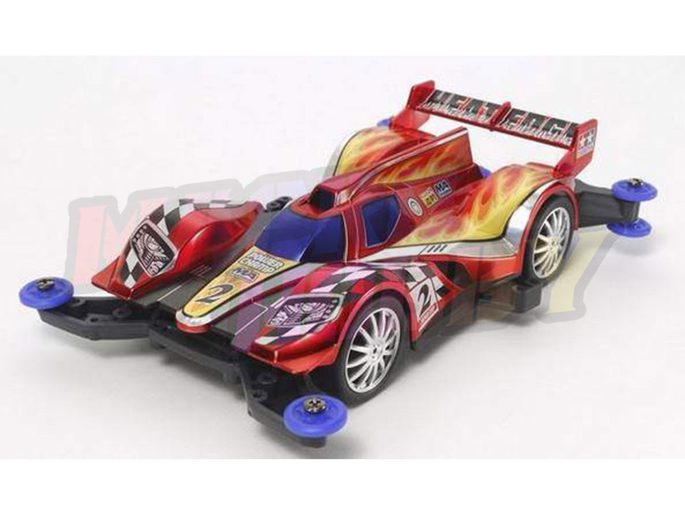 About the Heat Edge Red Metallic This exciting new limited edition release of the Heat Edge commemorates the Tamiya Mini 4WD Japan Cup 2014 racing series. The Heat Edge body is reminiscent of a prototype racing car, and it features bumper canards on the front sides, in addition to a large shark fin which stretches from the cockpit to the rear of the machine. It is a truly aerodynamic design with high performance under its belt as the mid-ship motor MA Chassis provides a high-performance, aerodynamically efficient base. Features and Specification Scale : 1/32 Construction type : Assembly snap together kit Chassis Type : MA Motor : 130 included Body material : ABS plastic Body stickers : Included Special feature 1 : Length: 156mm, width: 97mm Special feature 2 : The distinctive Heat Edge body is given a matte Red metal-plated finish. Special feature 3 : Features stylish matte Silver color metal-plated wheels. Special feature 4 : Runs on Black 26mm diameter low-profile tires. Special feature 5 : Gear ratio = 3.5:1 Requires A : 2 AA batteries Requires B : Small Phillips screwdriver Requires C : Plastic modeling side cutters