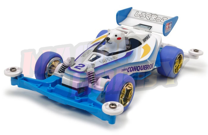 DESCRIPTION This is a re-issue of the handy finished model of Mini 4WD Shirokumakko, which just requires two AA batteries before you can get racing! This is great item for those without the time, space or confidence to construct and paint their own Mini 4WD kit. Finished Mini 4WD racer model. Length: 150mm, Width: 97mm. The Super-II Chassis is molded in glossy Light Blue ABS. Terra Conqueror Open Top body is molded in glossy White PS material, with stylish stickers already applied. The pre-attached “Shirokumakko” polar bear driver figure has eyes and nose pre-painted, and rosy cheek stickers applied. Metal-plated wheels are fitted with Blue small-diameter slick tires. Type 130 motor is included. The model features a 4:1 gear ratio. Two AA batteries are required (sold separately). A wide range of Grade-Up Parts is available separately to customize your machine.