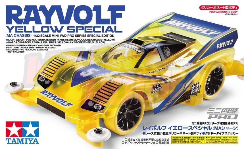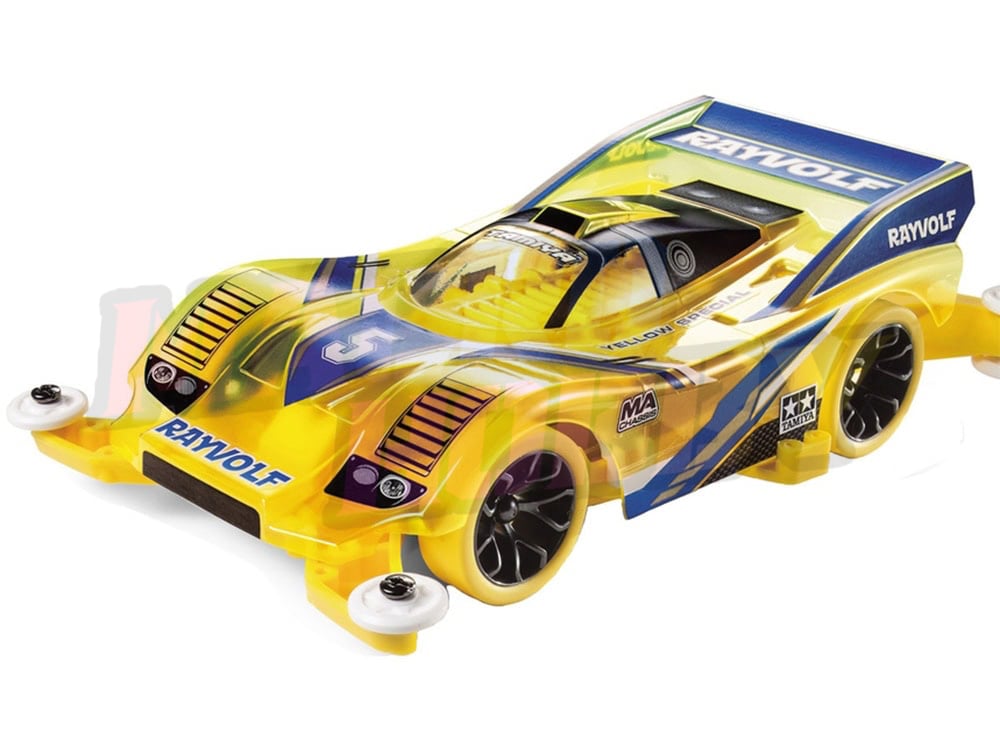 This special version of the Rayvolf uses a speed oriented clear polycarbonate body and pairs it with the cutting-edge MA (“Midship Aero”) Chassis. The MA machine has the best of the MS chassis, which uses a motor with dual shafts, and the AR chassis which employs many cool aerodynamic chassis features. It enjoys similar ease of maintenance to the MS chassis, and its employment of a 1-piece chassis enables the machine to achieve excellent power transmission. • Mini 4WD model assembly kit. • The MA chassis is molded in yellow ABS. • Features a clear polycarbonate body. • Dedicated clear stickers are packaged in the kit. • Black Y-spoke wheels are paired with hard, low-profile tires in yellow. • Type 130 double shaft motor is included. The model features a 3.5:1 gear ratio. • Two AA batteries are required (sold separately). • A wide range of Grade-Up Parts is available separately to customize your machine.