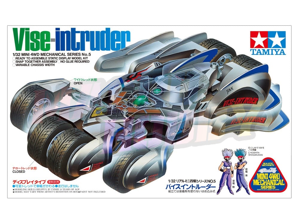 This assembly kit creates a static Mini 4WD model known as the Vise-Intruder, and which featured in classic Mini 4WD comics in Japan. It features a unique variable tread system that allows Wide Mode (with front wheels in their widest positions) and Battle Mode (with front wheels pushed in side-by-side). Metal-plated parts give the model a mechanical look worthy of this Mini 4WD Mechanical Series subject. With alterations, the body and other components can be installed on the Super X, Super-1 and Super TZ chassis to create a racing model. Specifications ★Length: 178mm (Battle Mode) or 150mm (Wide Mode) ★Width: 67mm (Battle Mode) or 100mm (Wide Mode) ★Height: 36mm ★Easy snap-together assembly