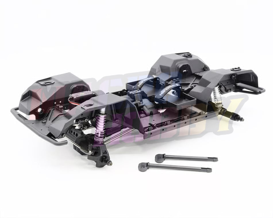 The VS4-10 chassis uses heavy-duty steel C-channel frame rails for strength and scale authenticity, reinforced by molded crossmembers in high-stress areas. Integrated mounting positions for electronics, dual servo options, and clean winch line routing make the platform adaptable for advanced builds. Molded rock sliders with replaceable outer sections protect the body, while the machined aluminum panhard mount ensures precise suspension geometry under load. The molded inner fenders double as adjustable shock towers, securely capturing the tops of the ninety-millimeter shocks for consistent performance on rugged trails.